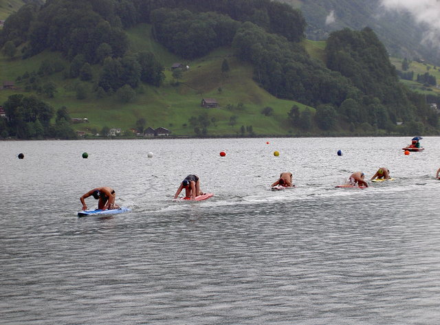 Tegen die tijd begon het ook te donderen, maar Wolfgang schakelde heel snel. De Boarders mochten nog wel gaan, maar de zwemmers bleven thuis. Zo werd er even een swim-leg uit de Taplin geplukt, maar iedereen was allang blij. Zo hoefde Michael Illinger ook niet meer te zwemmen, maar mocht hij de "sprint" afleggen naar goud. Of eerder supersprint als het aan de afstand ligt, want langer dan 15 meter is het strand niet aan de Lauerzersee. Ondanks dat het strandje maar twee afgelegd hoefde te worden, wist Hemd toch nog een tegenstander voor Zevenaar af te schudden en kwam daarna als zevende dóór de finish. Heythuysen pakte de 14e plek. Daarna was het hele spul ineens wel heel snel van het strand verdwenen om een veiliger heenkomen te zoeken.